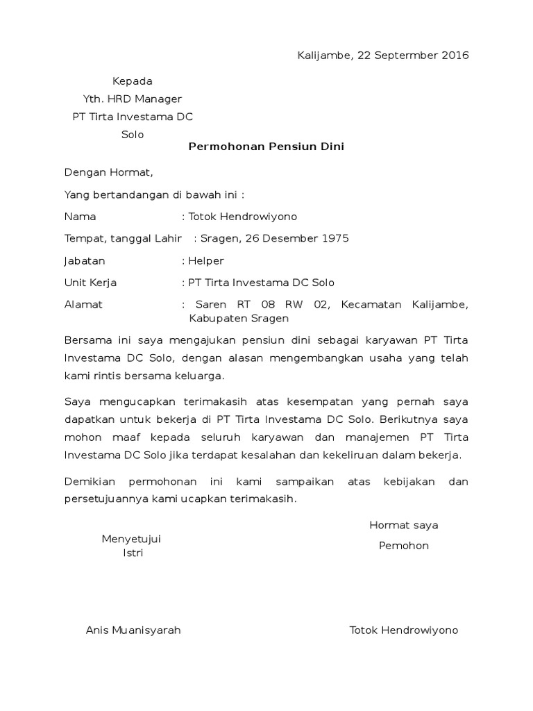 Contoh surat pengajuan yang baik dan benar. Admin blog berbagi contoh surat 2020 juga mengumpulkan gambar gambar lainnya terkait contoh surat pengajuan pensiun dini pns dibawah ini. Hrd manager pt tirta investama dc solo permohonan pensiun dini dengan hormat, yang bertandangan di bawah ini : Admin blog dapatkan contoh 2019 juga mengumpulkan gambar gambar lainnya terkait contoh surat pengajuan pensiun dini karyawan swasta dibawah ini. Contoh surat pengajuan pensiun dini.